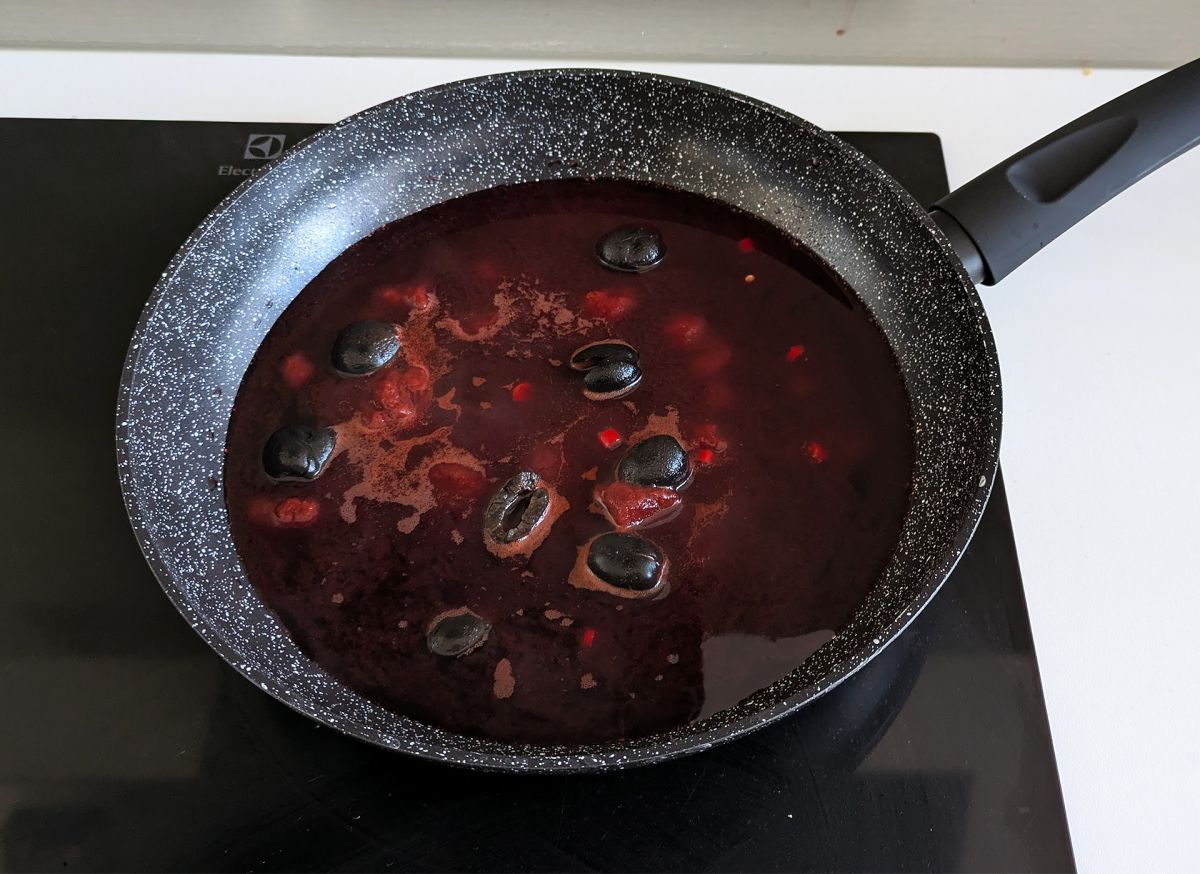 Füge den Wein, das Tomatenmark, die gehackte Chilischote und die Oliven zur Pfanne hinzu. Rühre um und warte, bis der Wein zu kochen beginnt.