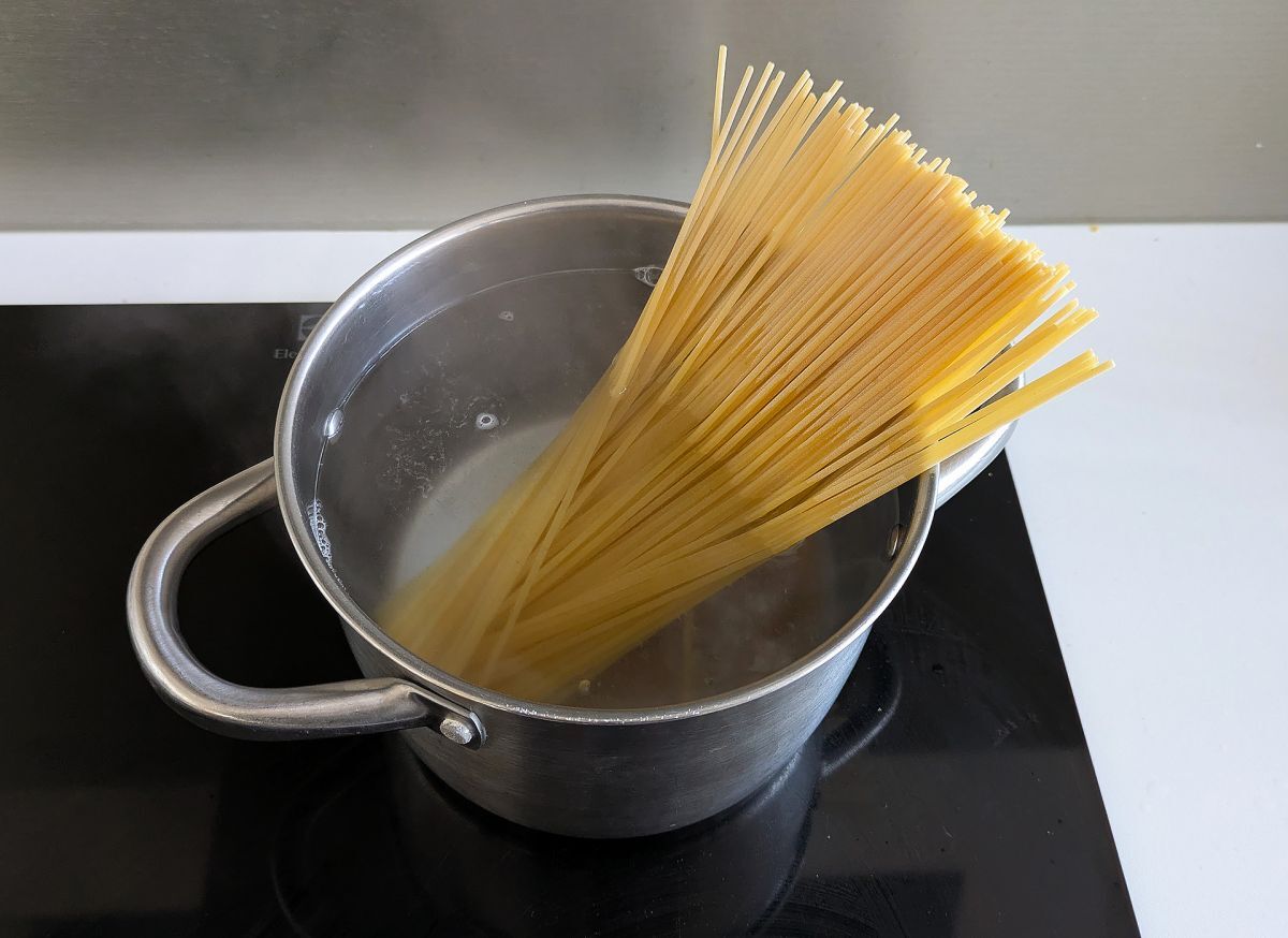 Die Spaghettis im siedenden, schwach gesalinten Wasser für ungefähr 4 bis 5 Minuten köchen lassen. Sie sollen bissfest, jedoch nicht total weich werden.