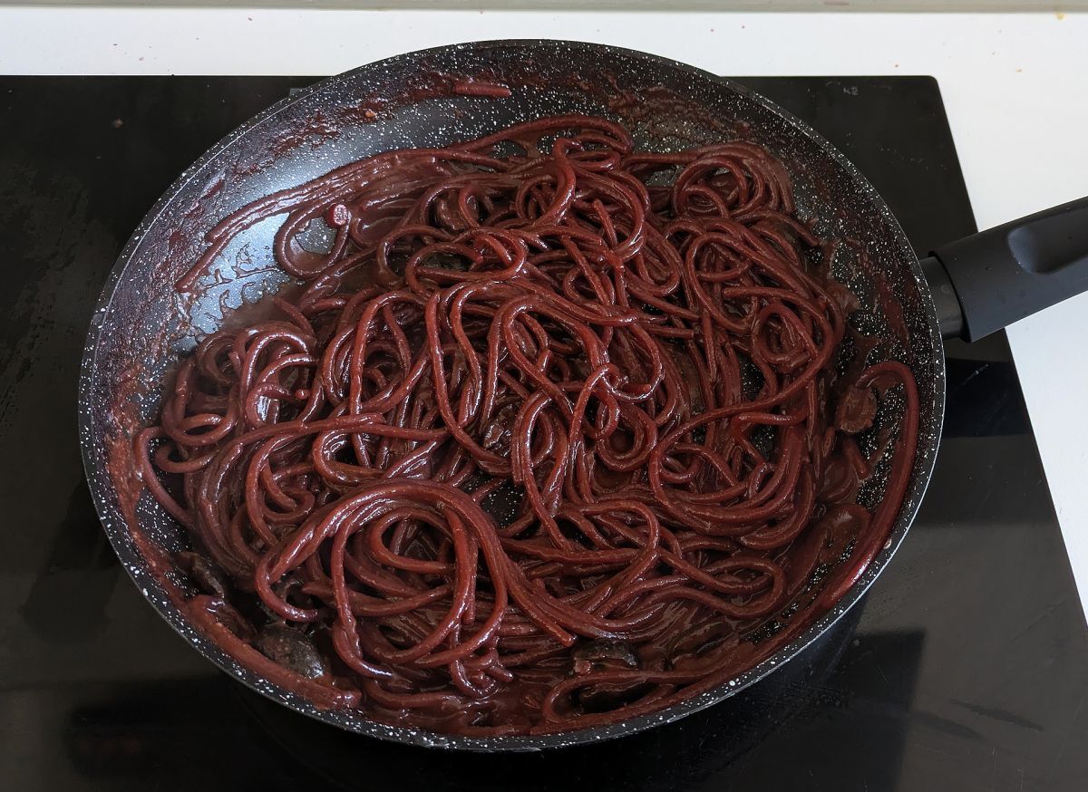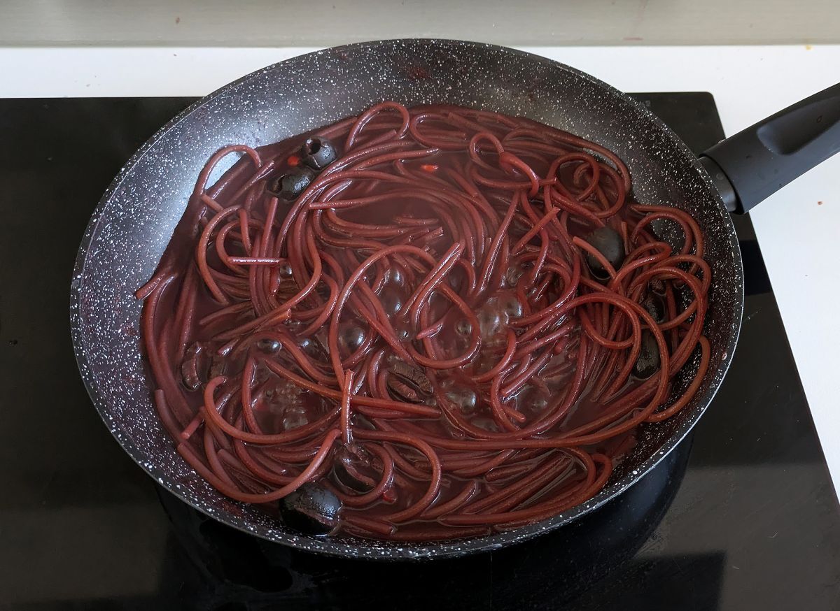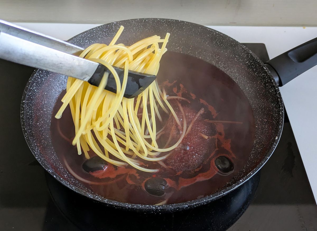 Gleich die Nudeln in die Pfanne mit dem Wein umgießen.