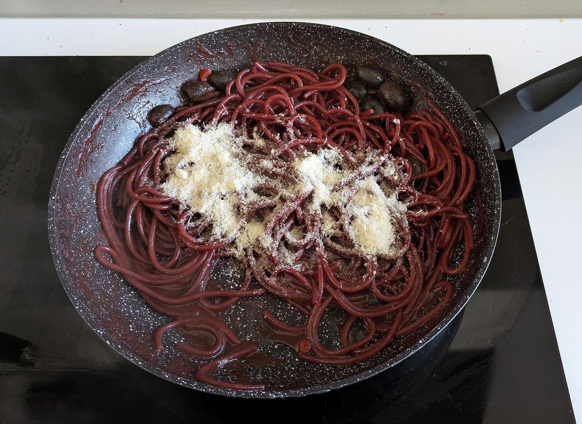 Nimm die Pfanne von der Herdplatte und füge den geraspelten Parmesankäse hinzu.